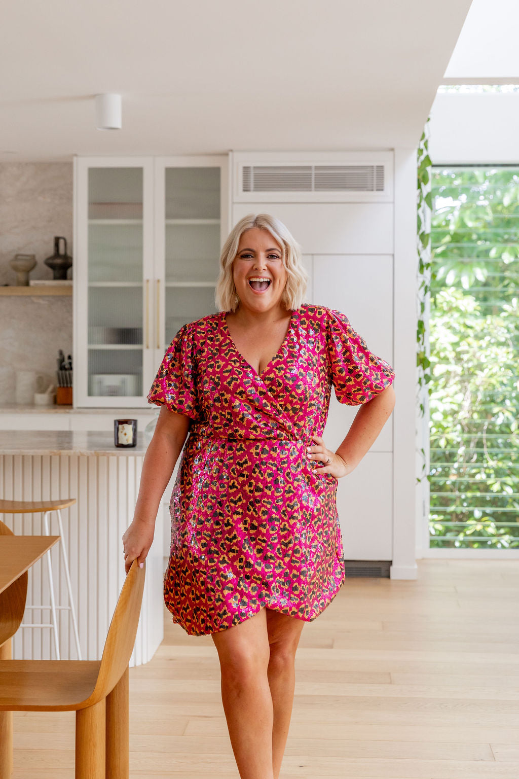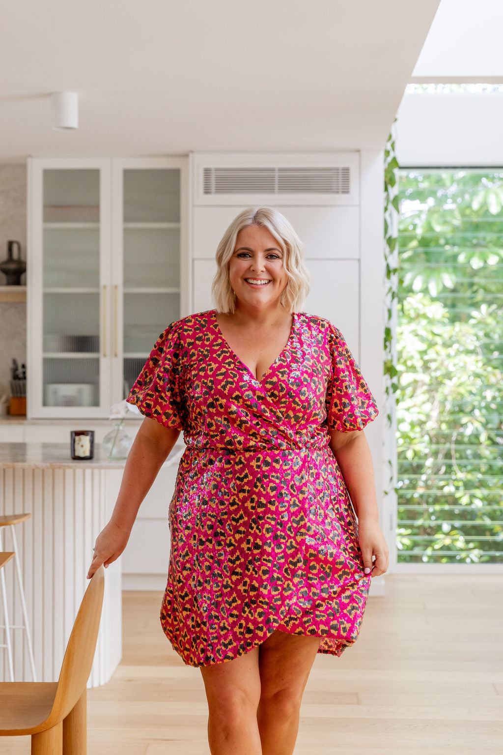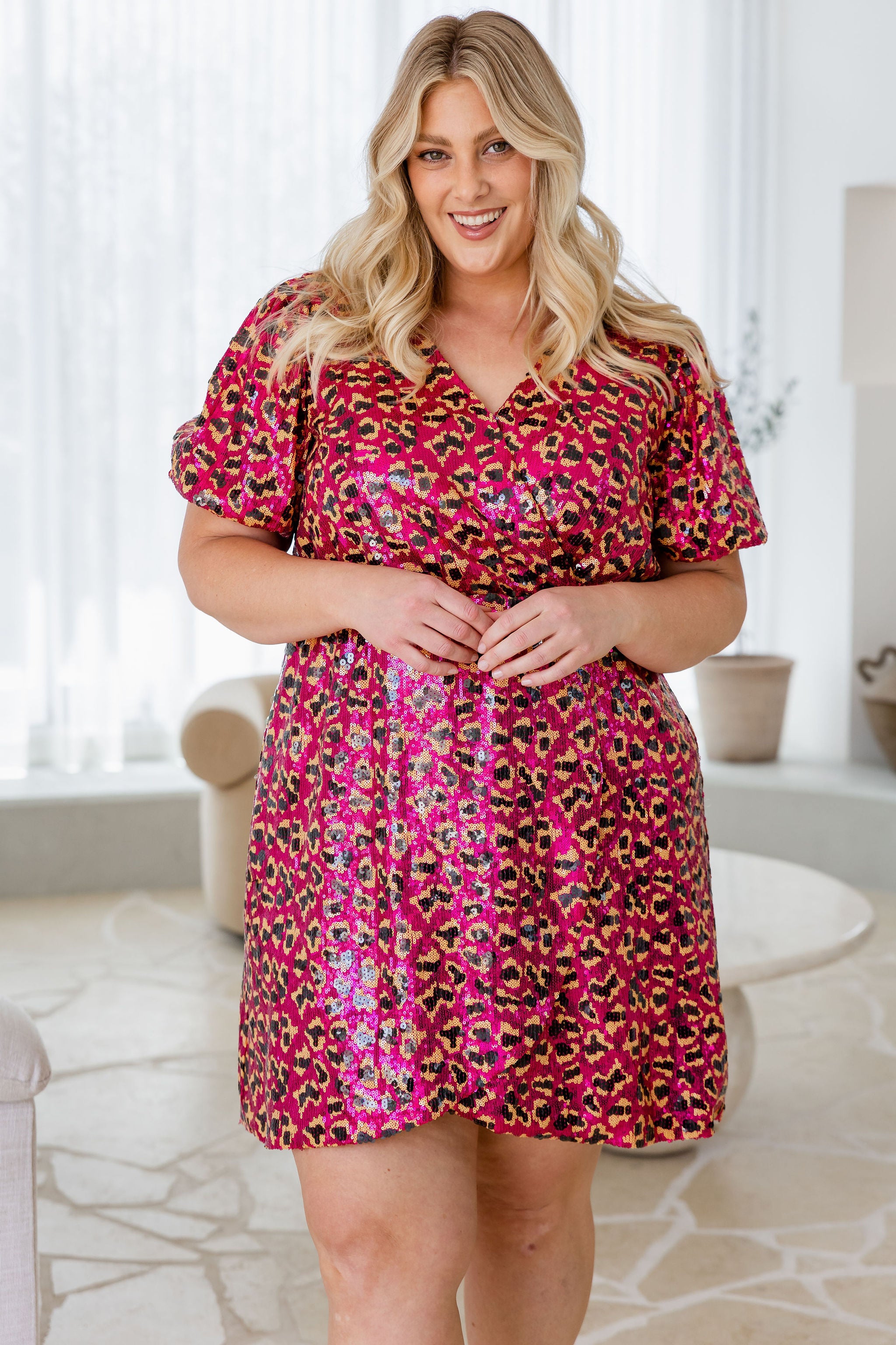 Unleash your wild side with the Nicolette Sequin Dress! Featuring a glamorous V-neckline and a fixed wrap front, this dress combines elegance with bold style. The elastic waist offers a comfy, flattering fit, while the puff sleeves with lining add a chic touch. Crafted from stretch sequin fabric and fully lined, it’s as comfortable as it is dazzling. Perfect for turning heads, this sparkly leopard pink stunner is your ultimate party-ready look!