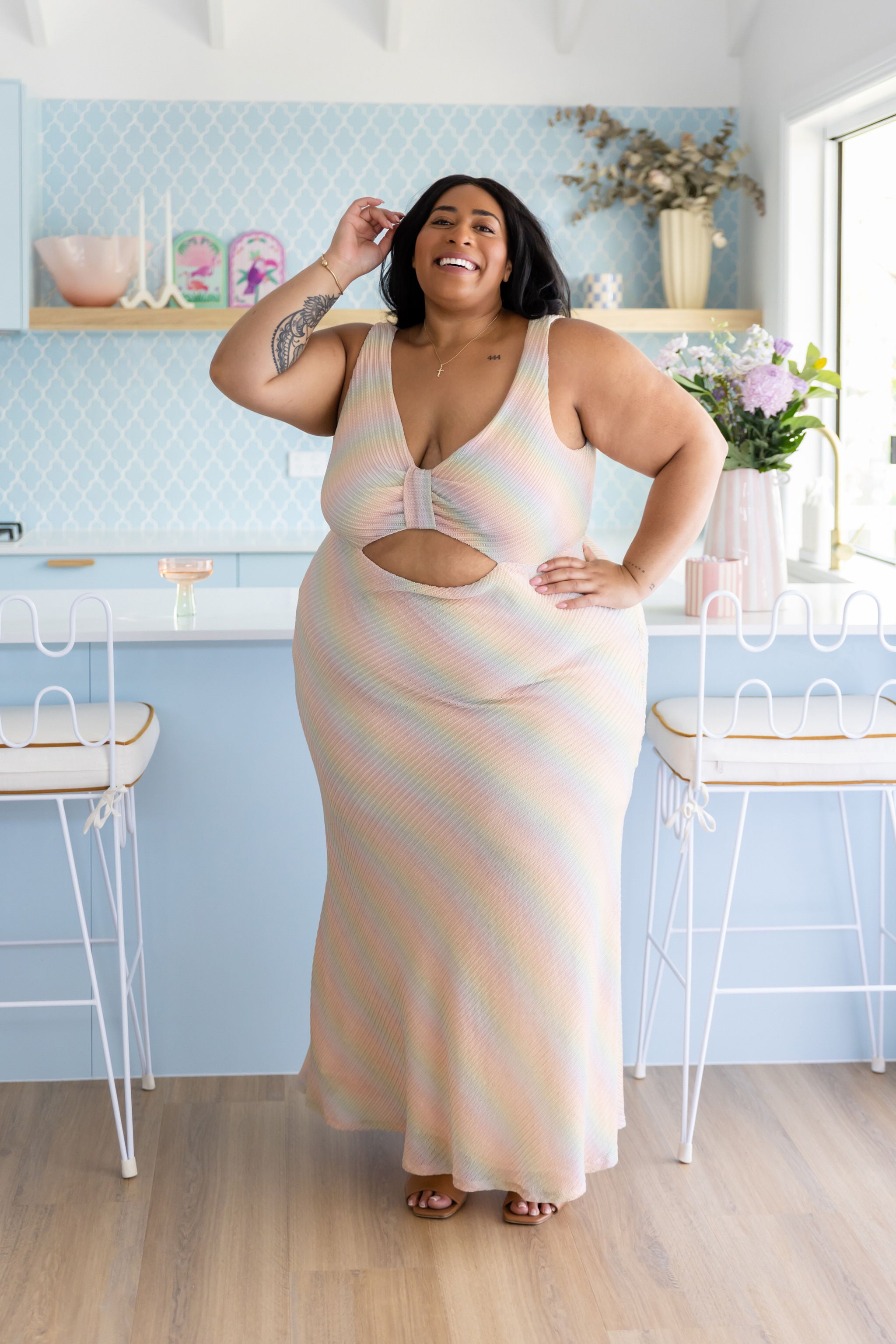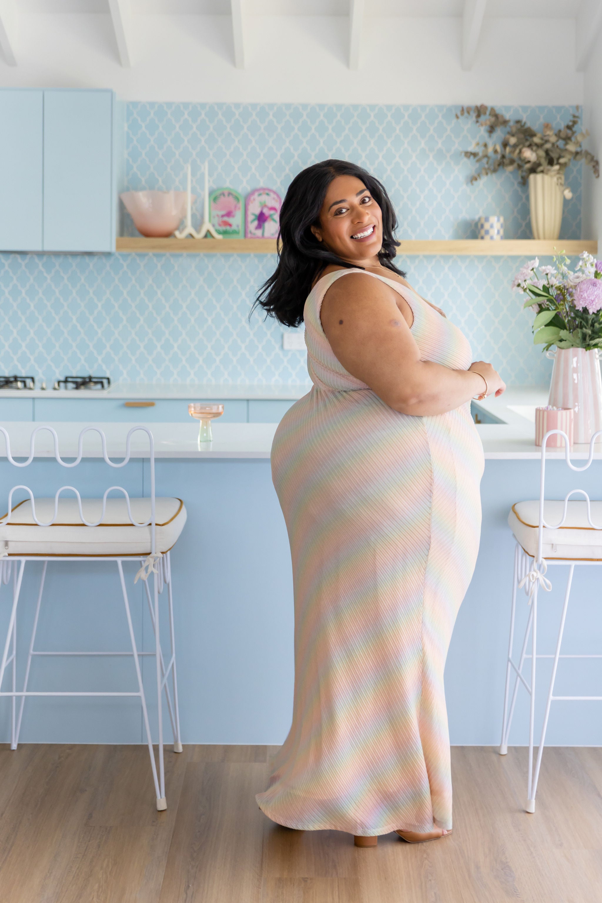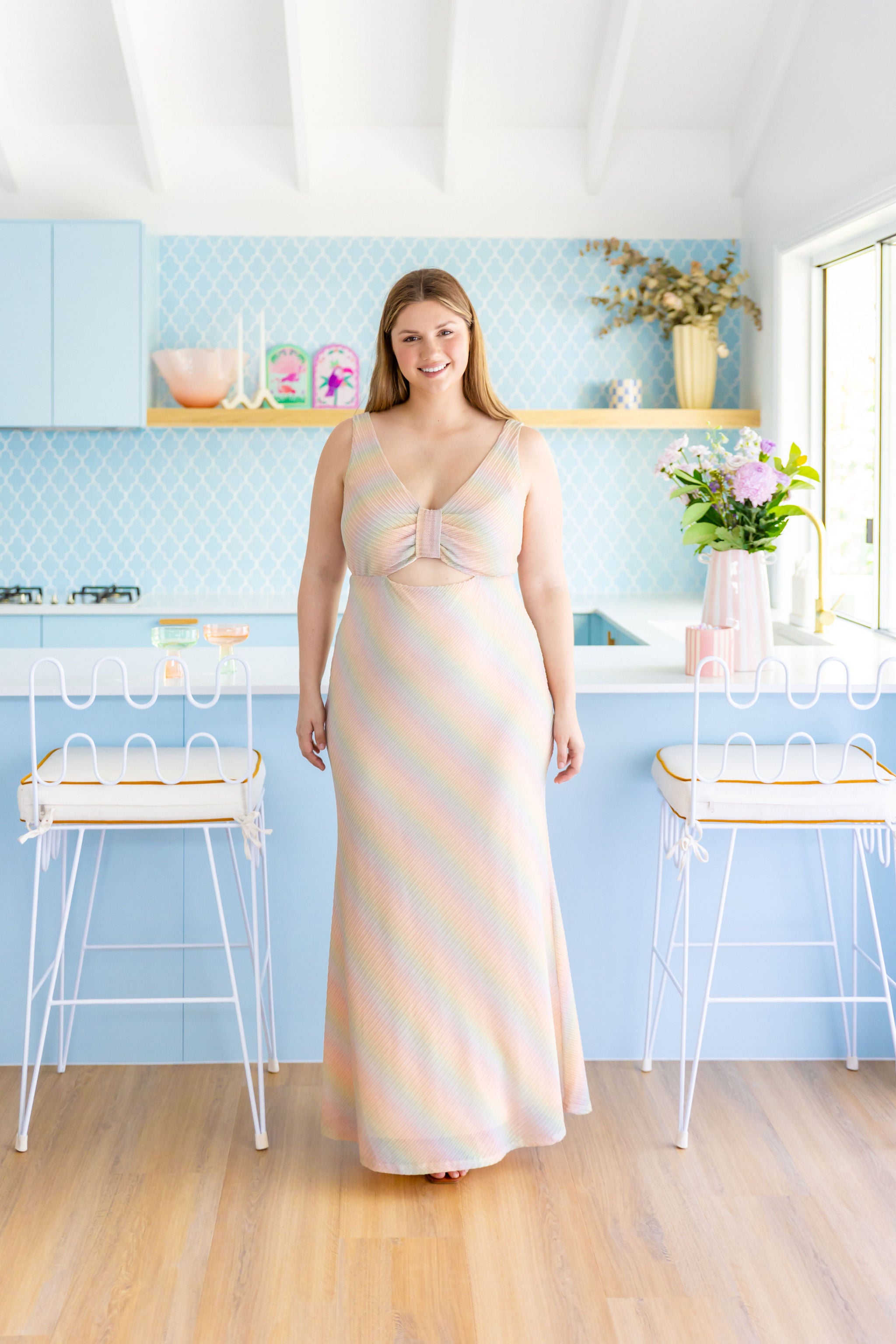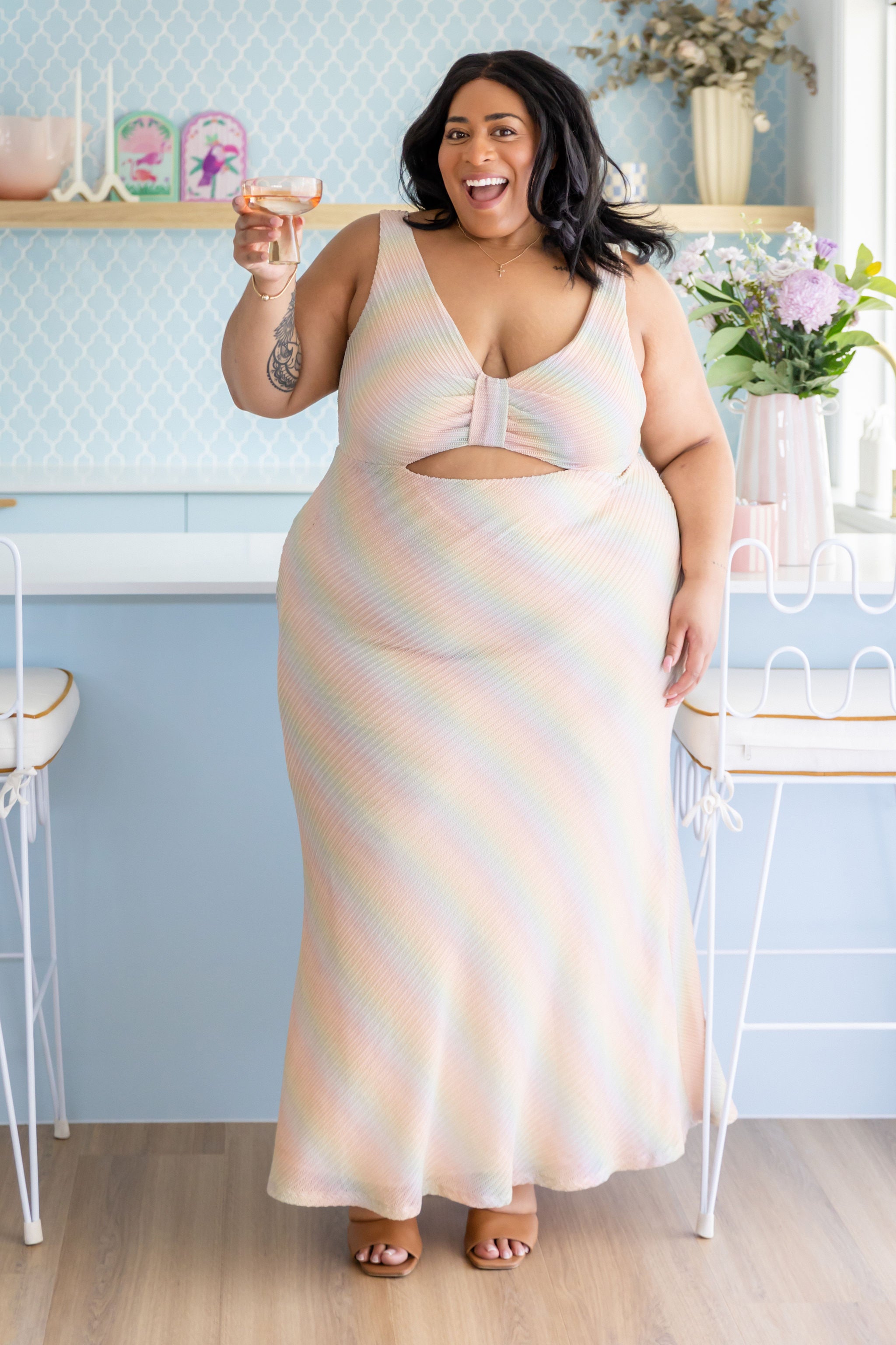 Shine bright in the Tallulah Dress in Metallic Rainbow! This eveningwear masterpiece features a V-neckline, ruched bust detail, side split, and a body-shaping fit. Made from super stretchy jacquard with stunning metallic rainbow foil, it’s the perfect formal dress for a dazzling look. Made for all body types, as the fabric falls exactly into place!