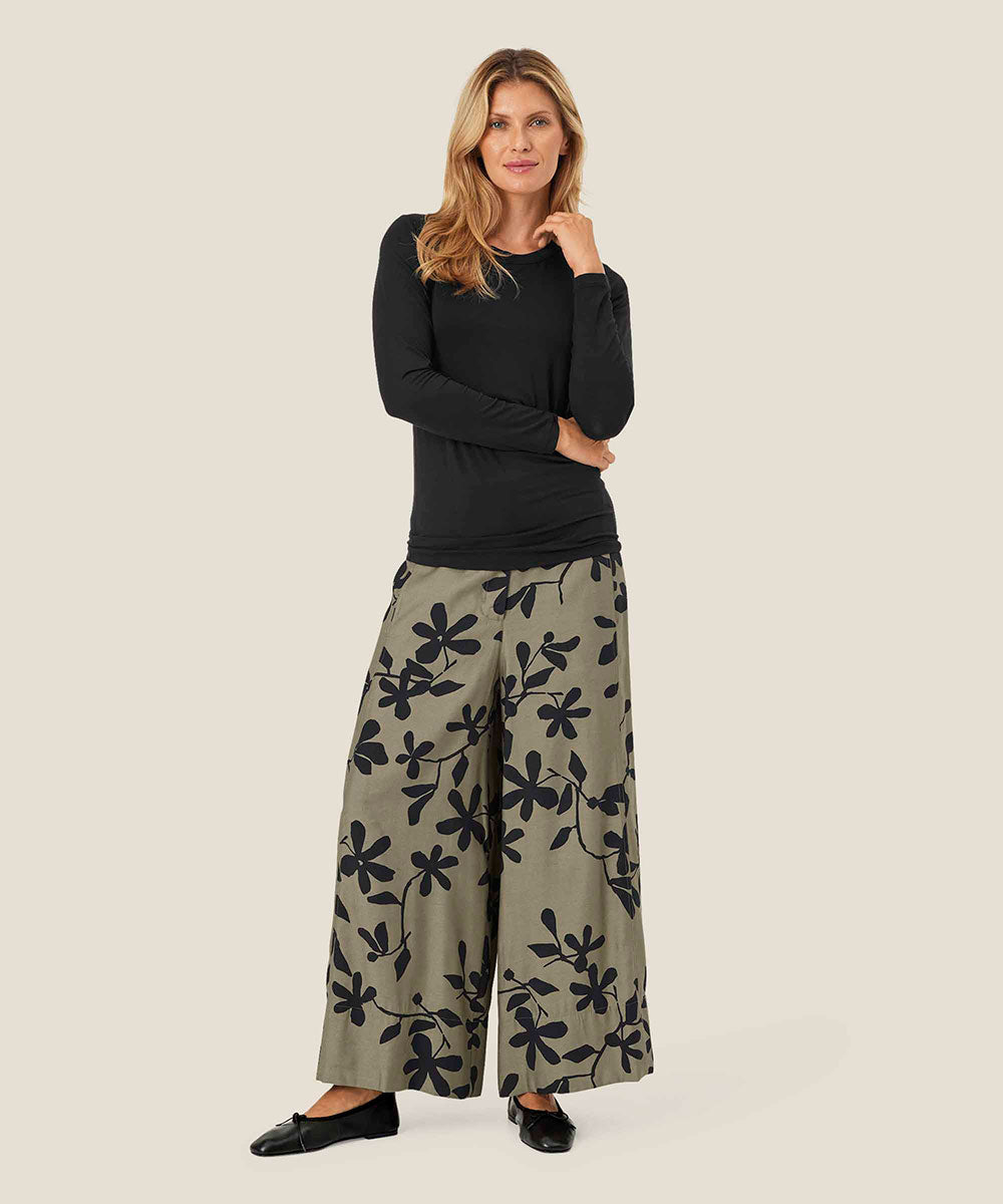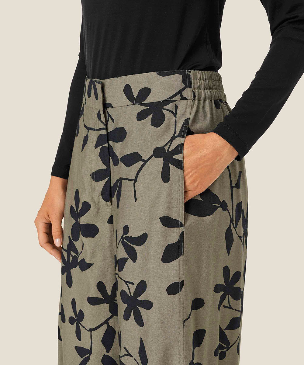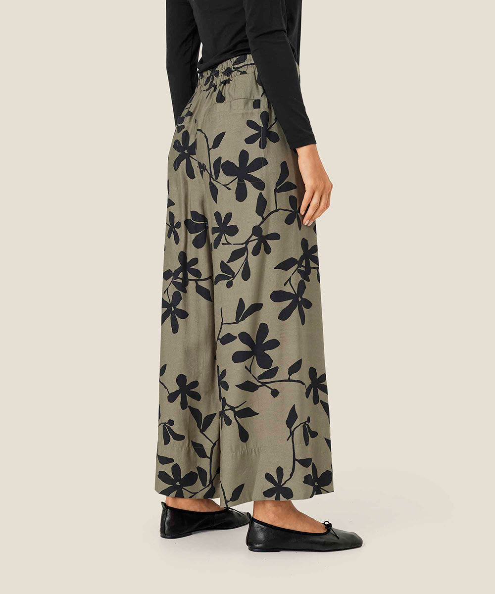 Transform your wardrobe with the Pasifica Wide Leg Pants, where artistry meets elegance. Adorned with a stunning hand-painted floral print, these trousers exude femininity and charm. Crafted from light and soft viscose, they feature an elasticated waistband at the back for ultimate comfort. Pair them with a solid-colored top for a sleek look, or elevate your style by creating a coordinated ensemble with our matching shirt for a polished finish.