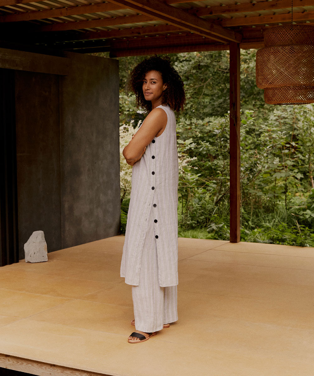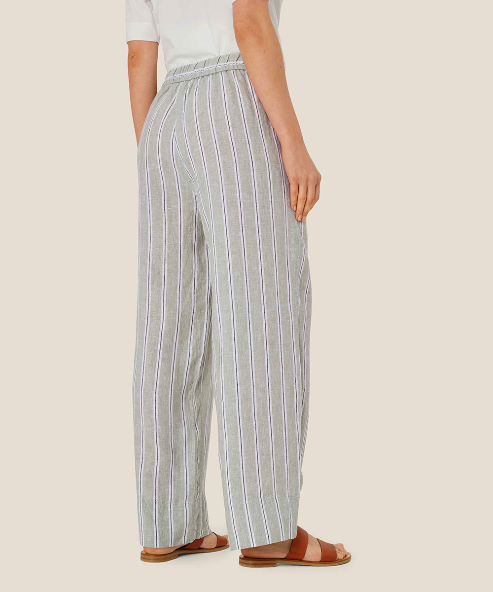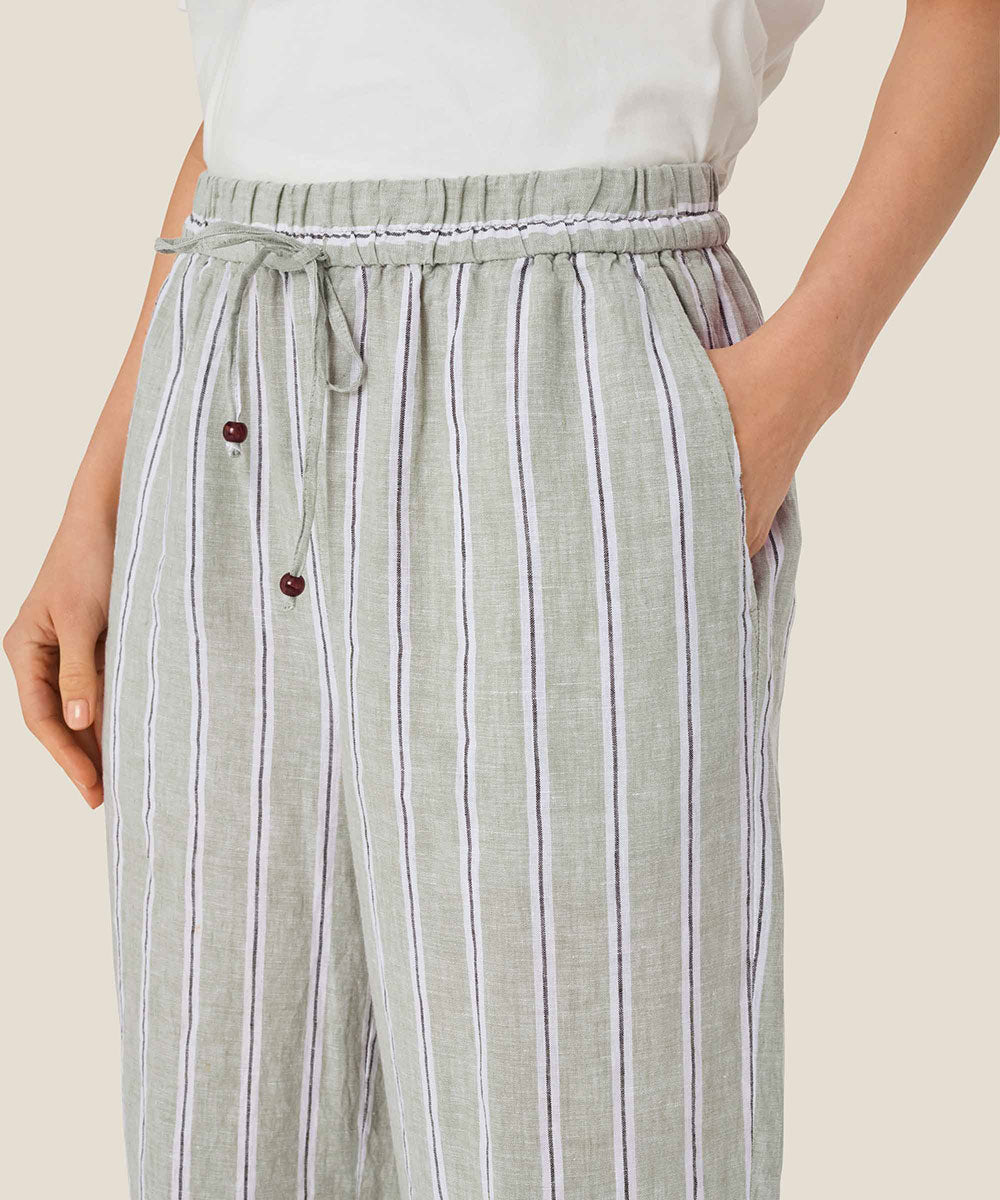 Crafted from lightweight linen with a timeless striped pattern, the Penla Linen Striped Pants feature a pull-on design for effortless style. The tie at the waist adds a flattering detail, allowing you to adjust the fit to your liking. These pants are a versatile and stylish choice for any occasion.