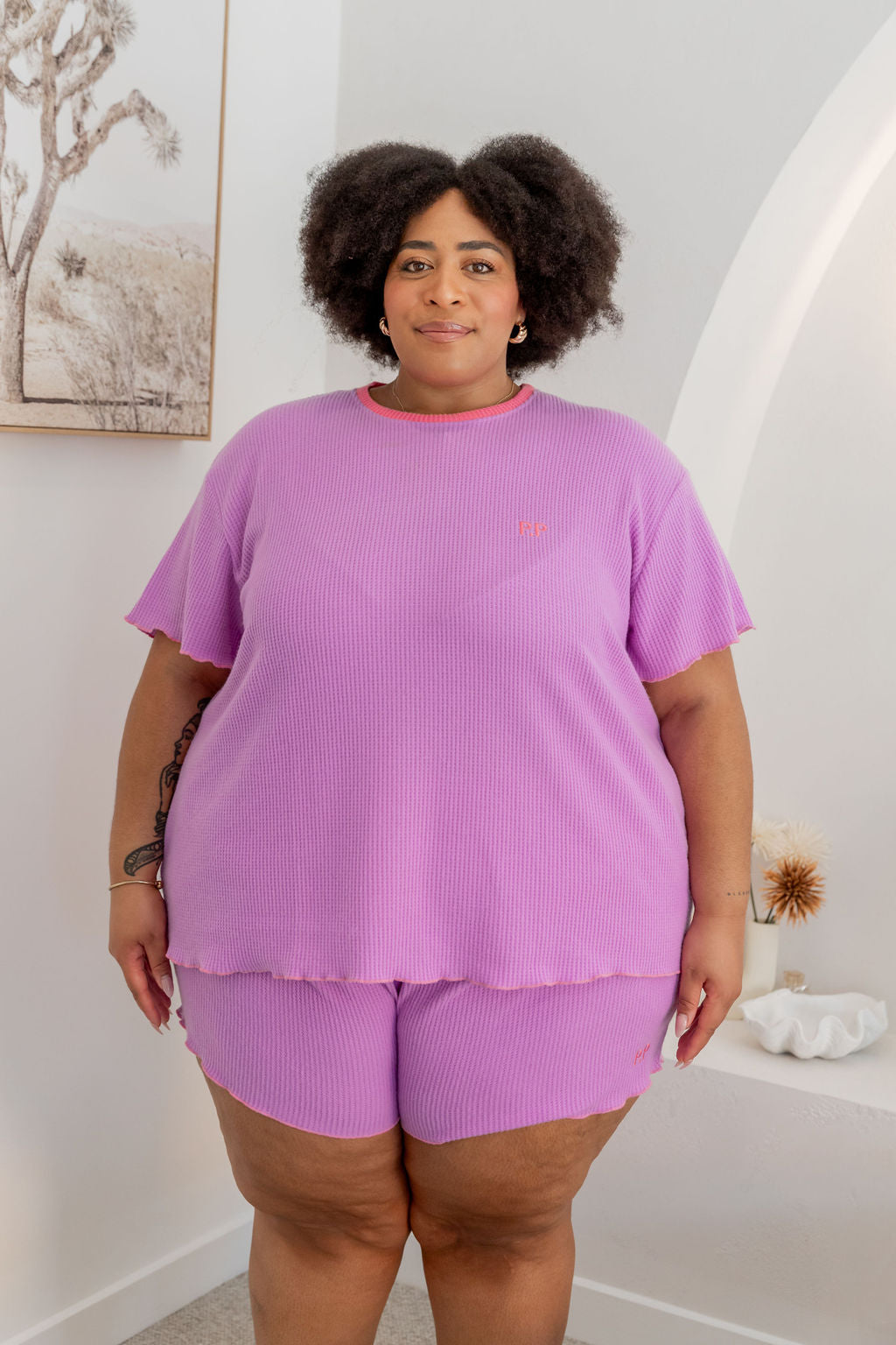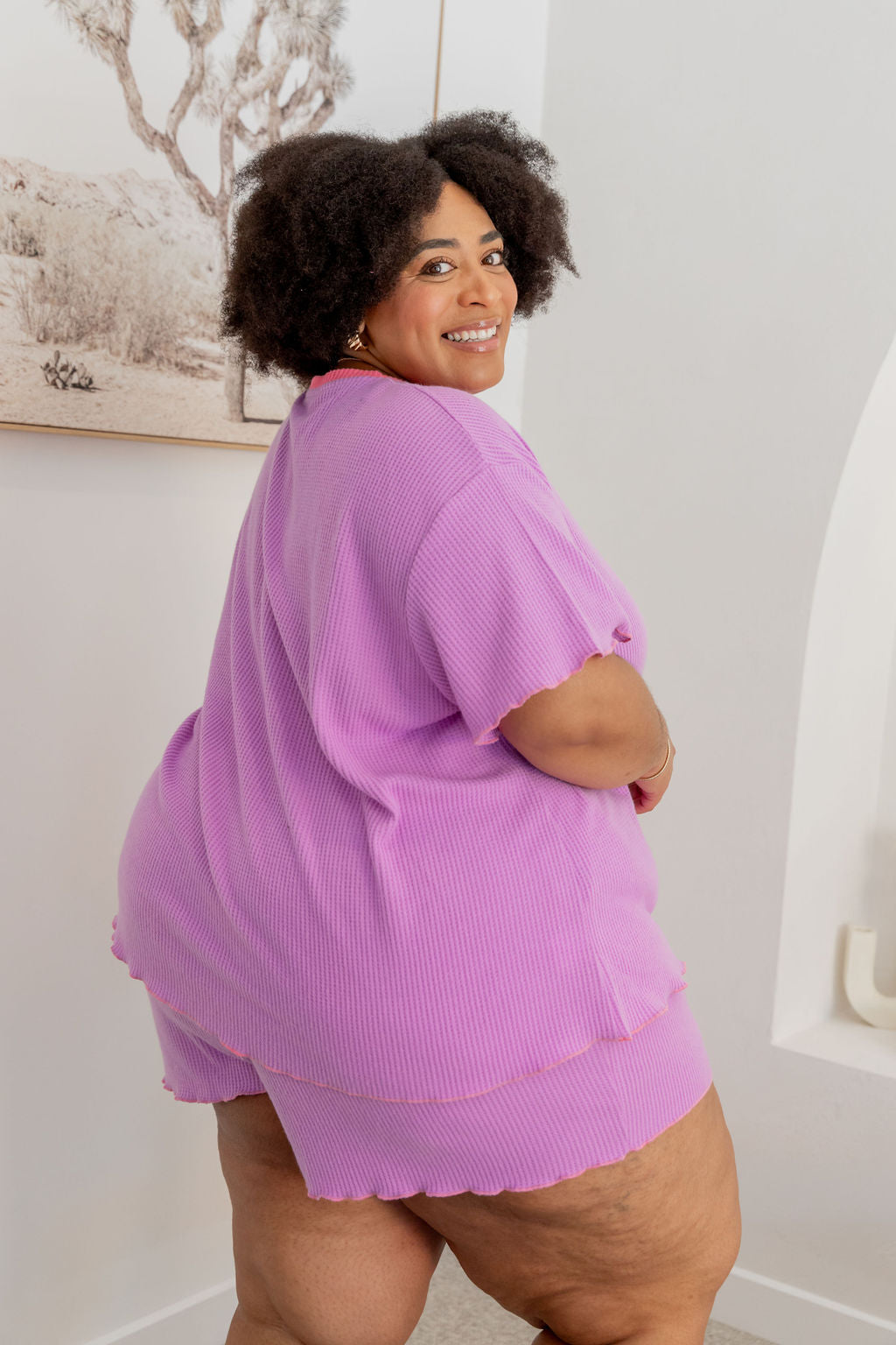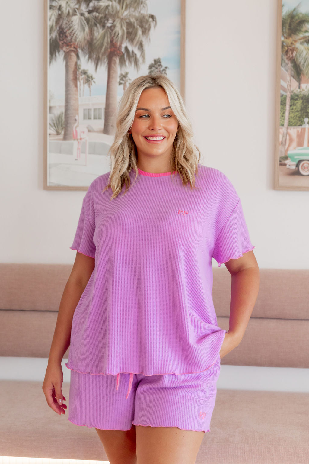 The Georgina Waffle Shorts are just as dreamy, complete with a thick elastic waistband, an adjustable drawstring for a custom fit, and convenient pockets. The frilled hem ties the set together for a playful yet relaxed vibe.