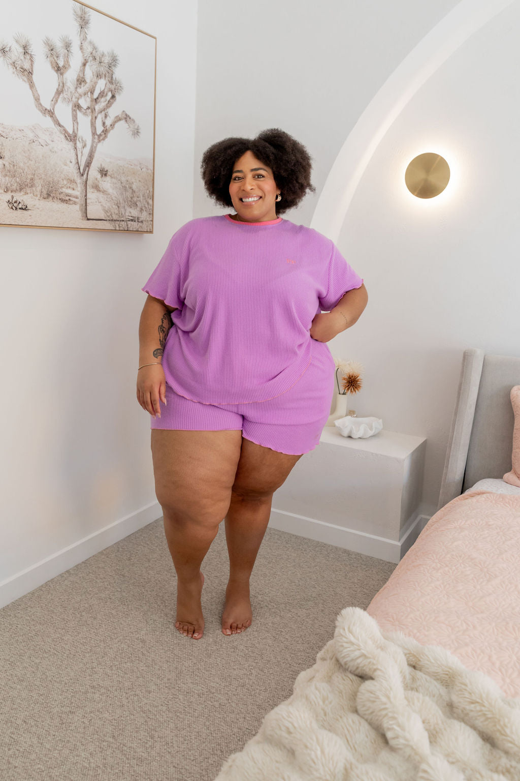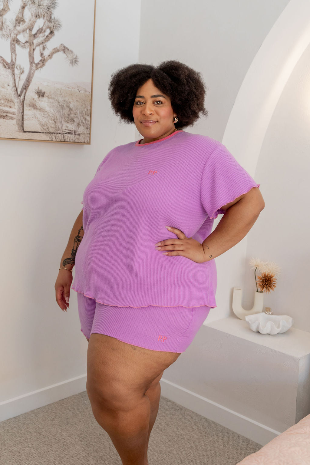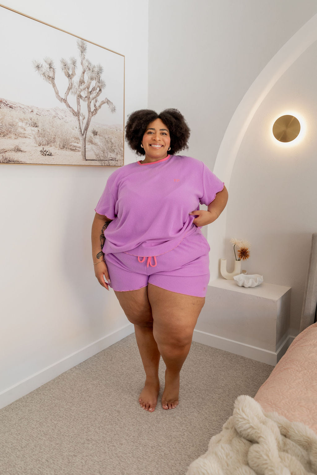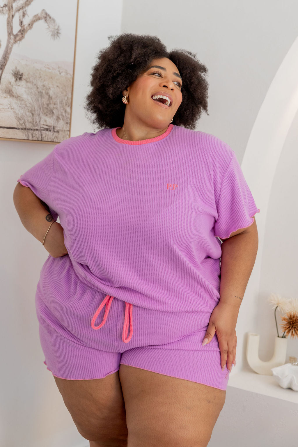 The Georgina Waffle Shorts are just as dreamy, complete with a thick elastic waistband, an adjustable drawstring for a custom fit, and convenient pockets. The frilled hem ties the set together for a playful yet relaxed vibe.