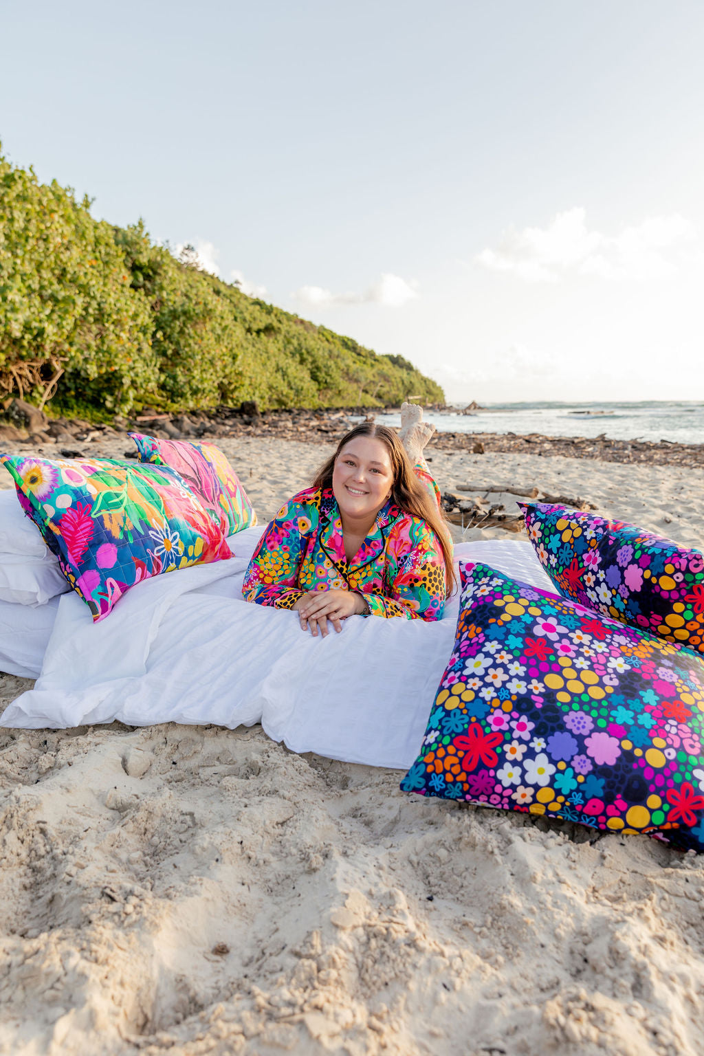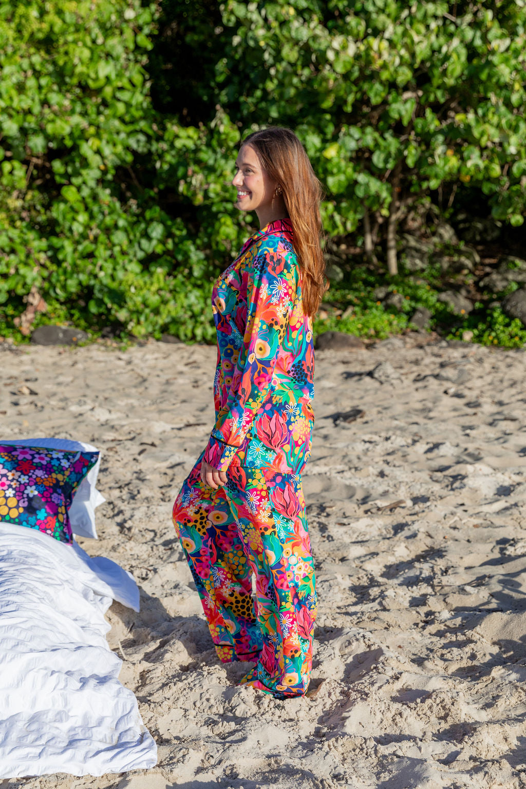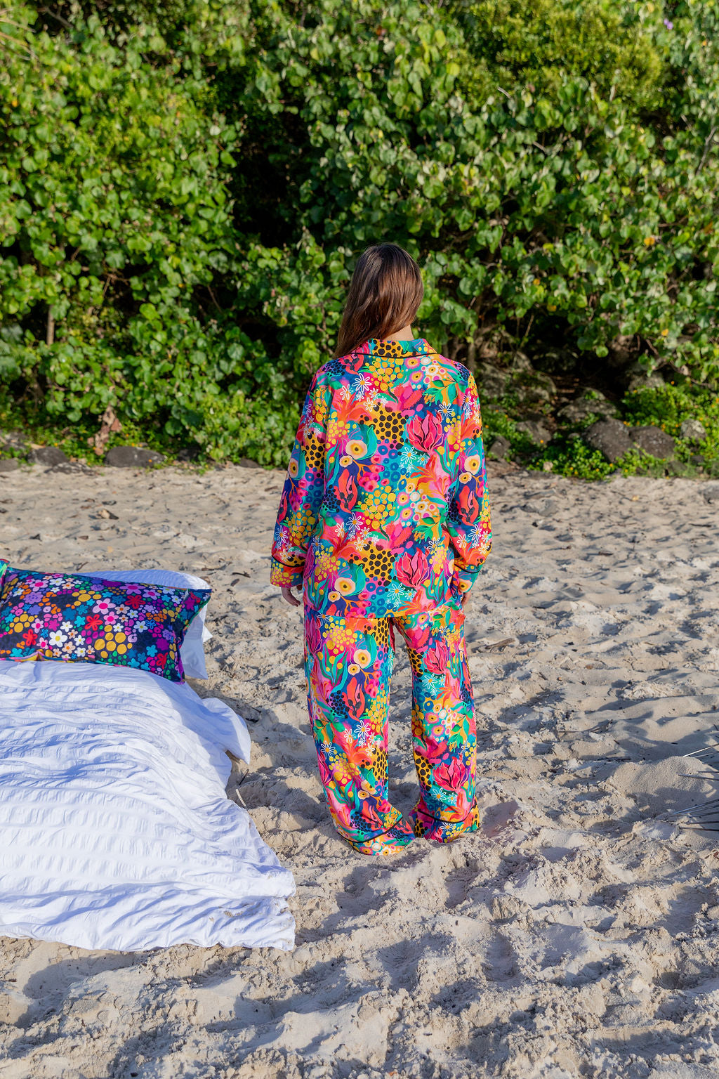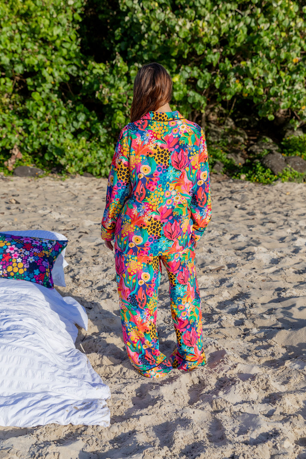Drift into dreamy comfort with the Sundown Long Sleeve Shirt and Pant Sleepwear Set in Matilda by Kasey Rainbow! Designed by the vibrant Australian artist, this set is the perfect blend of style and coziness.