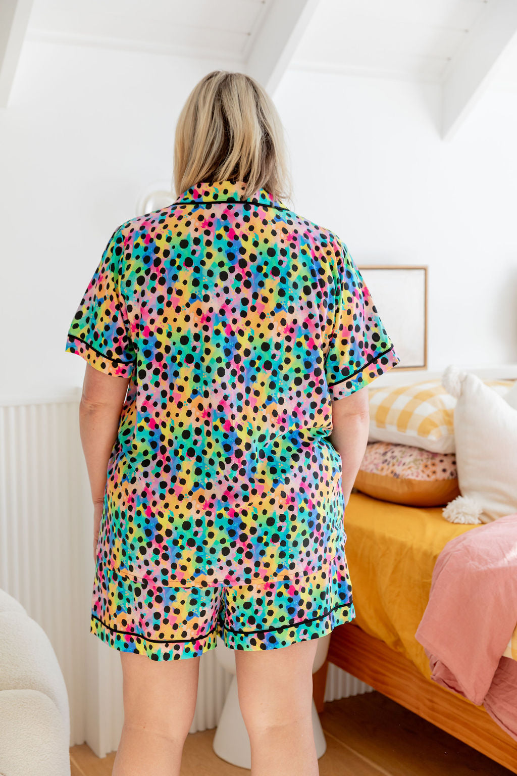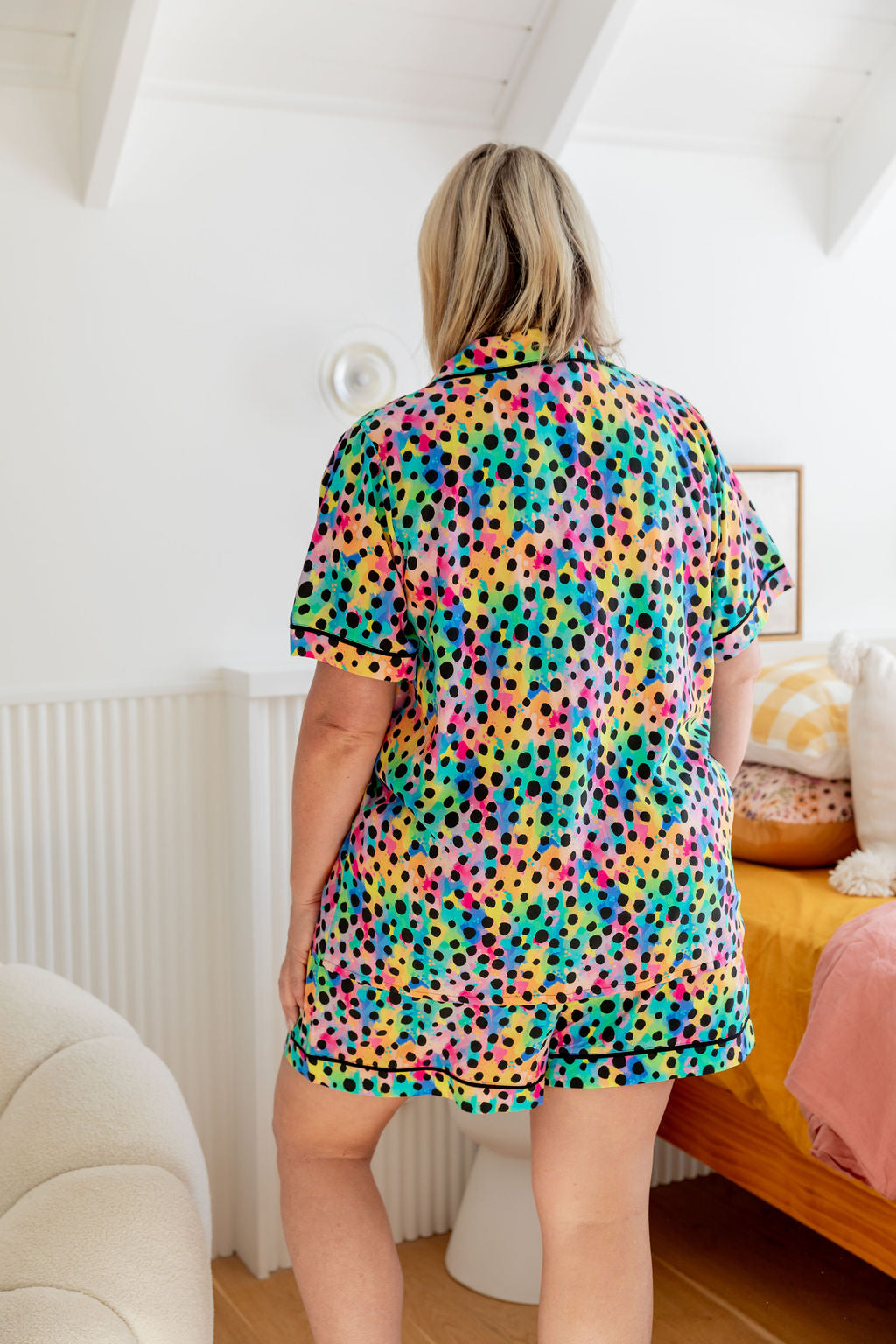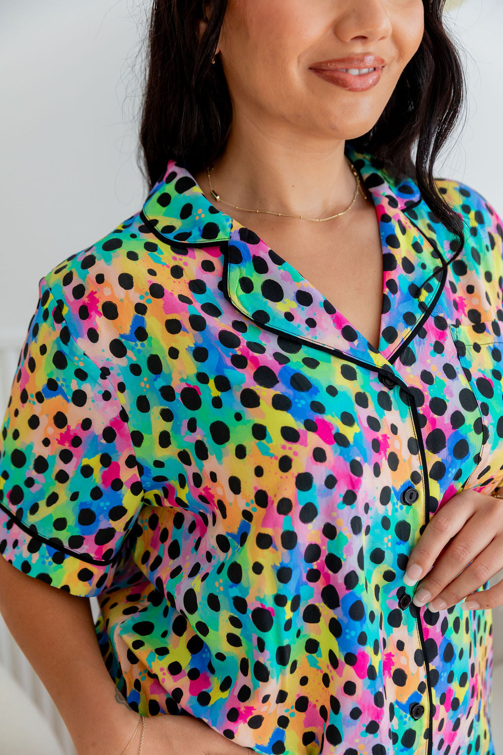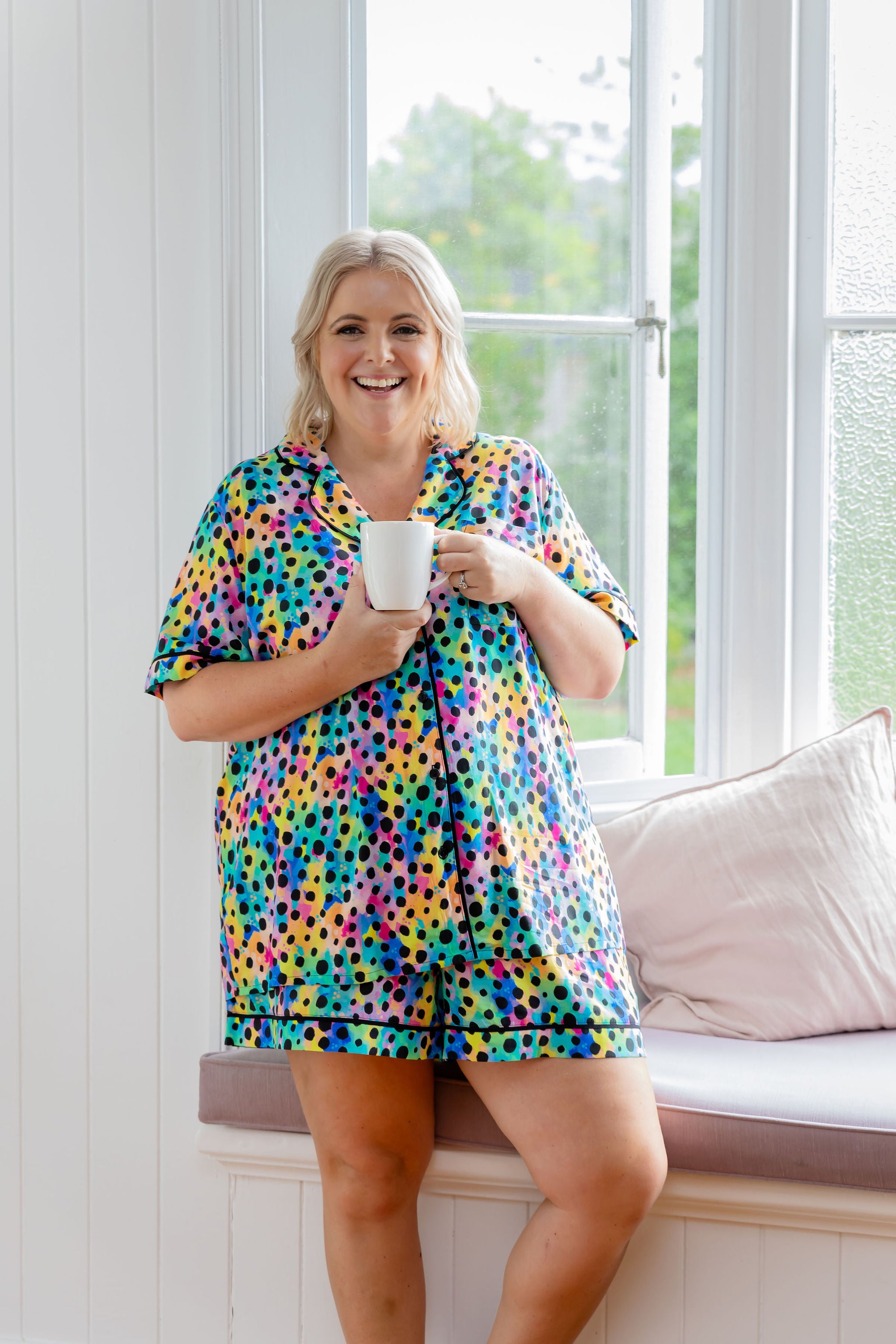 Say hello to your new fave lounge look—the Sundown Short Sleeve Shirt & Short Sleepwear Set in Rainbow Cheetah by Kasey Rainbow! Designed by the bold and brilliant Aussie artist herself, this set brings playful charm and cozy comfort together in one vibrant package.