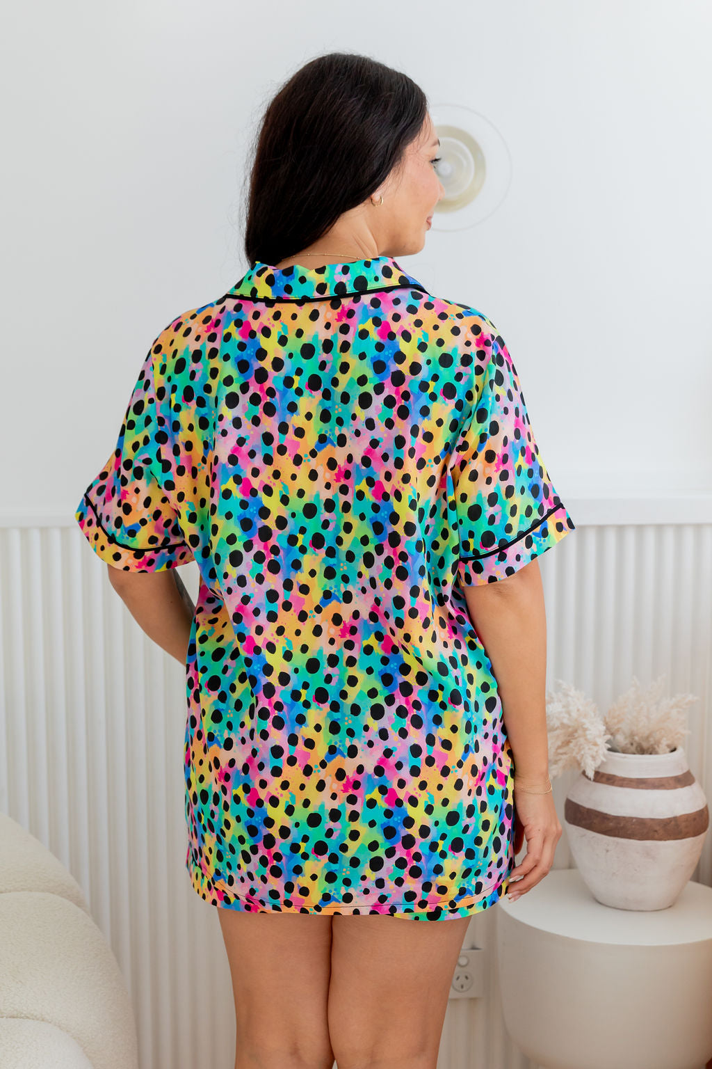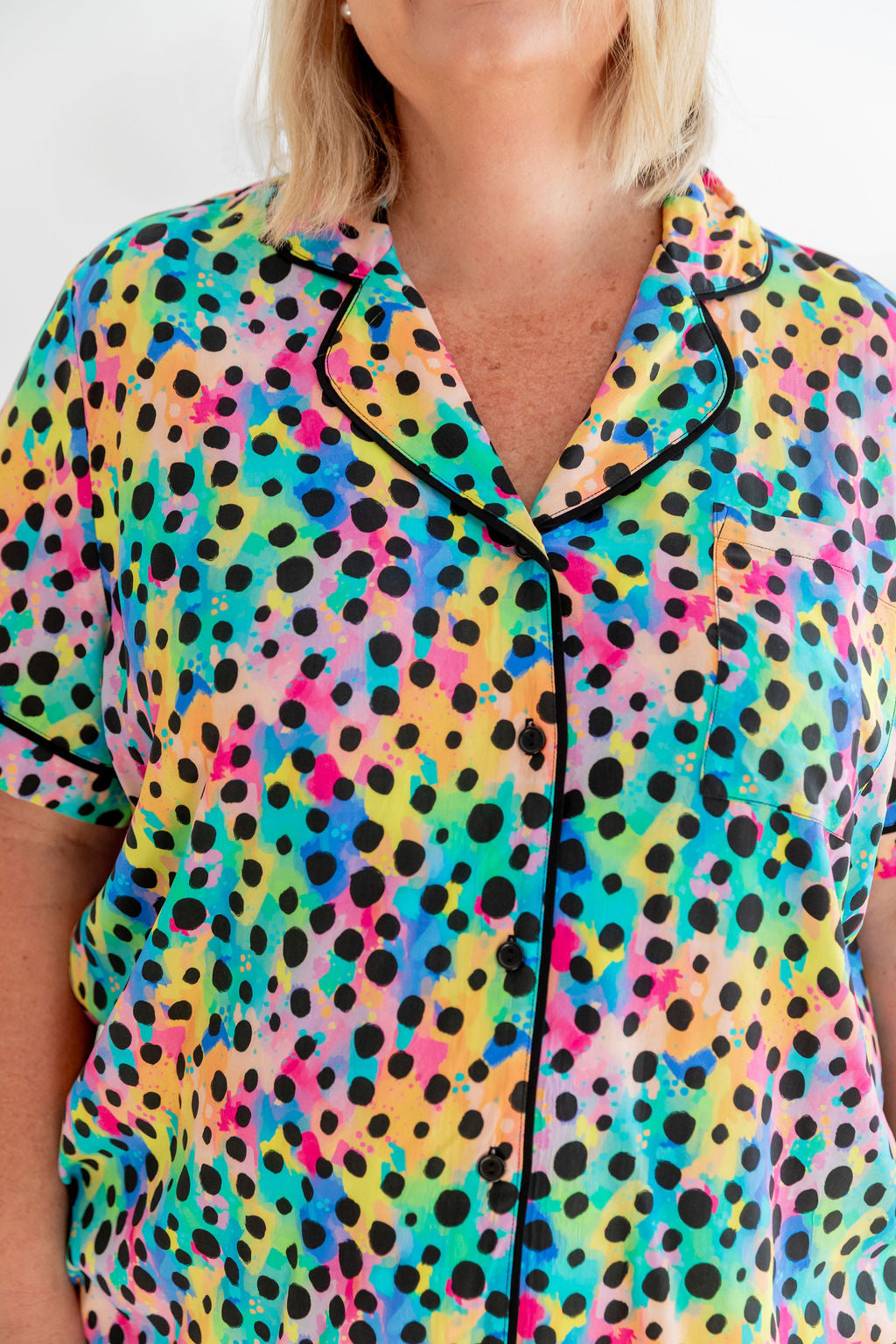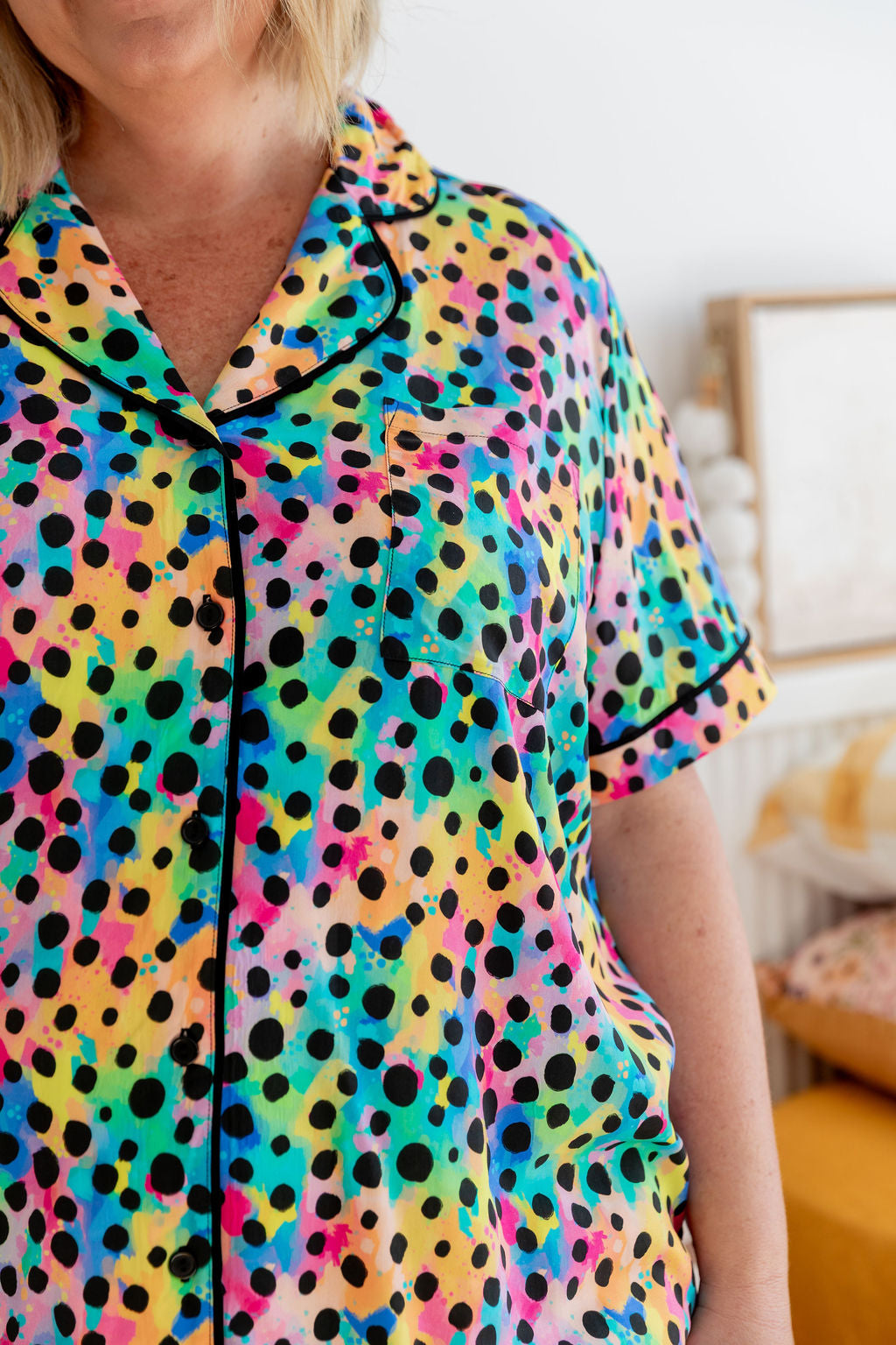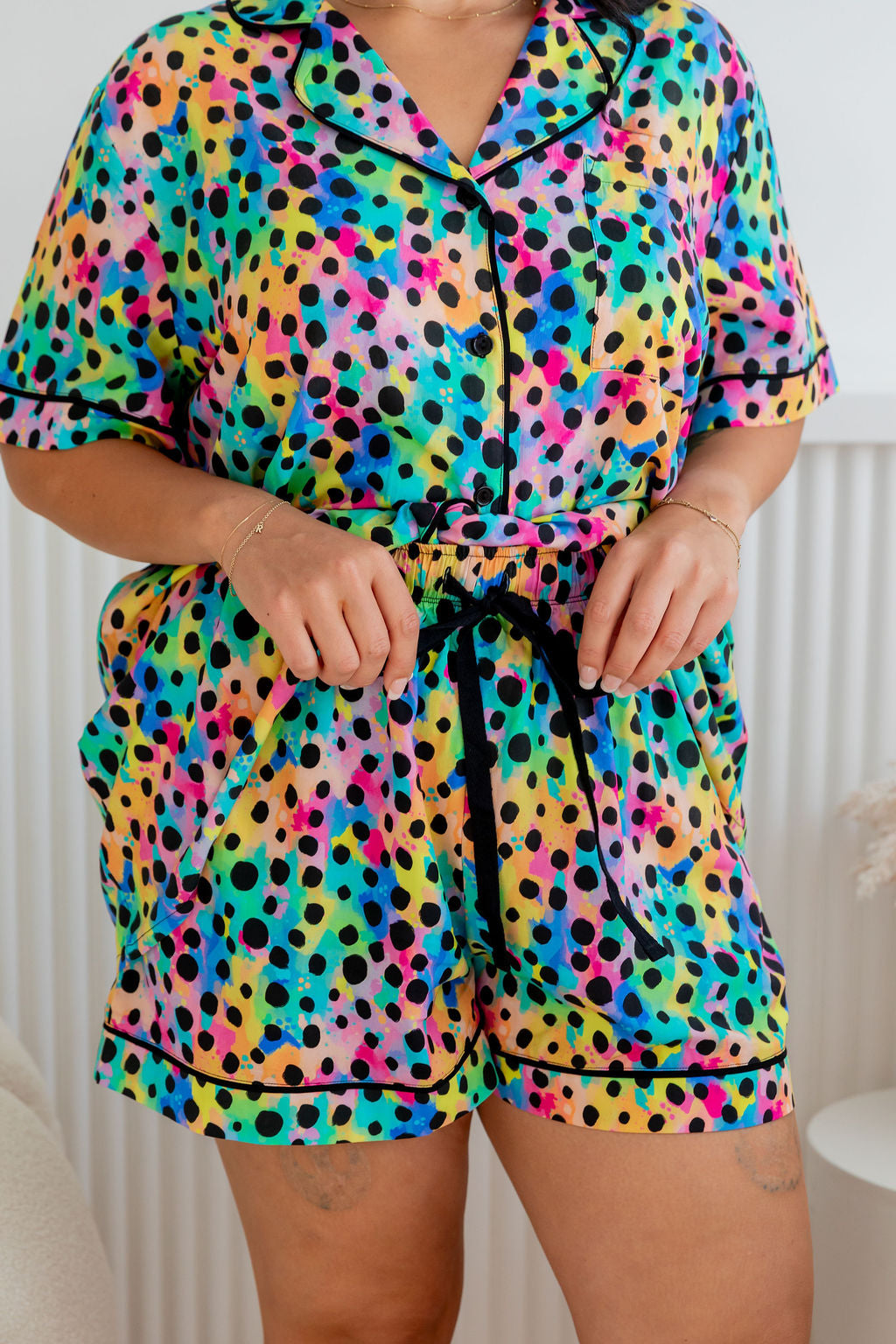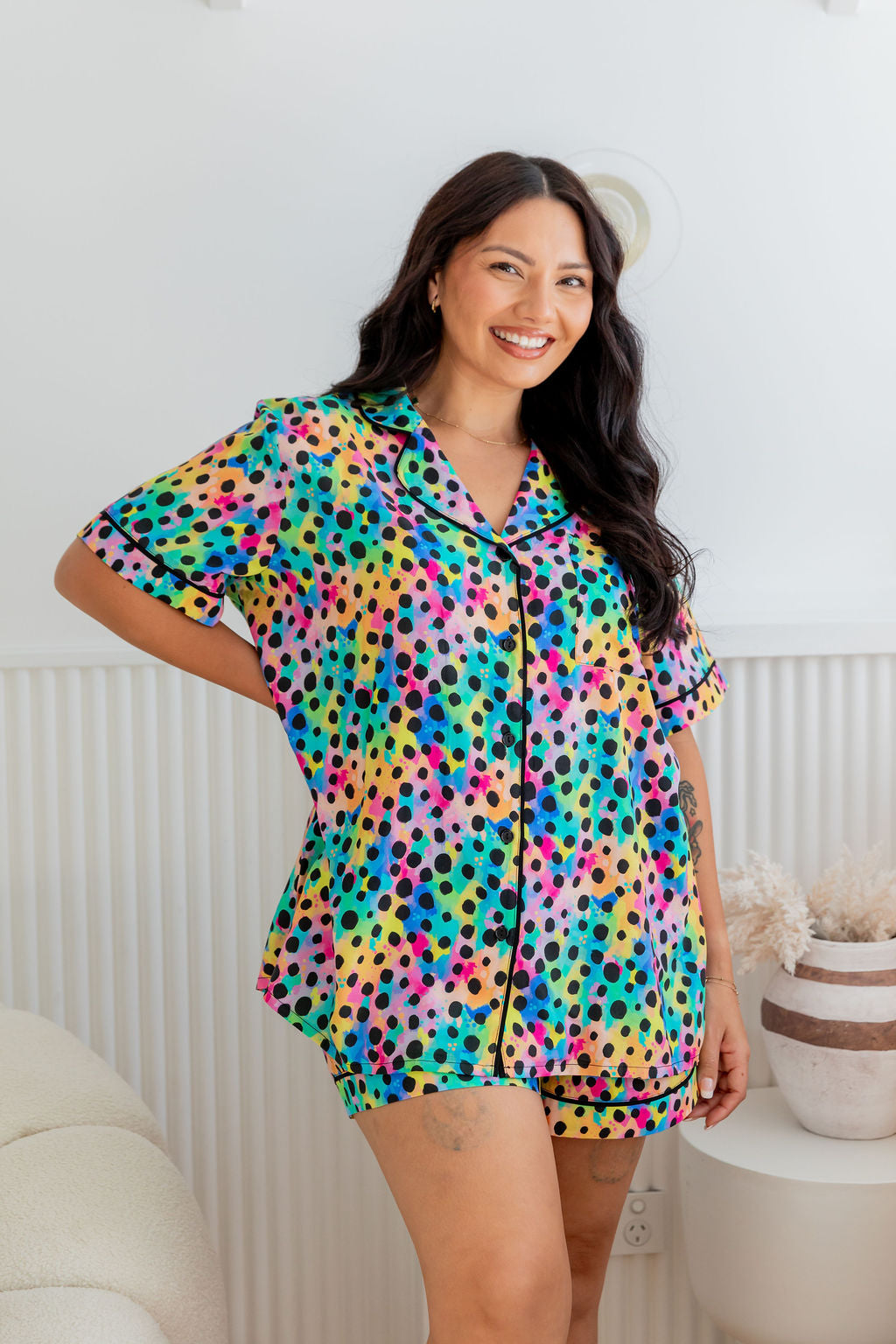 Say hello to your new fave lounge look—the Sundown Short Sleeve Shirt & Short Sleepwear Set in Rainbow Cheetah by Kasey Rainbow! Designed by the bold and brilliant Aussie artist herself, this set brings playful charm and cozy comfort together in one vibrant package.