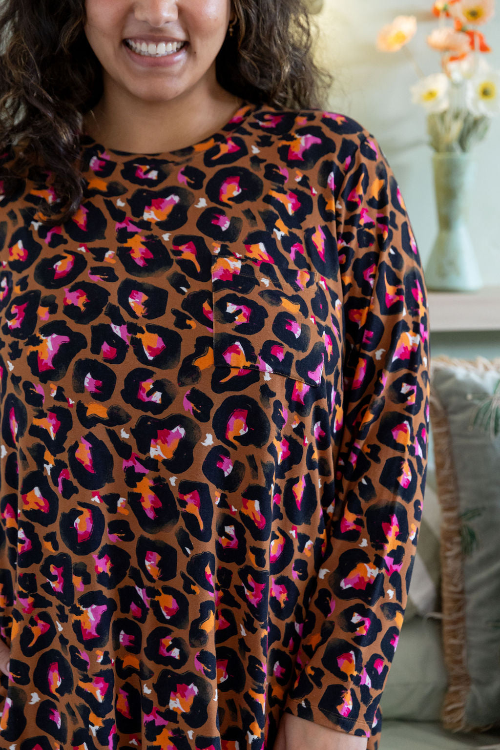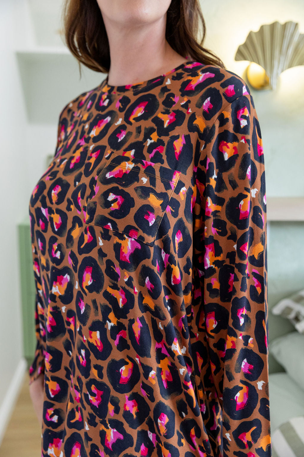 With its relaxed fit, soft long sleeves, and classic round neckline, it’s the perfect mix of comfort and sass. Whether you're lounging, snoozing, or just vibing around the house, this bold bronze leopard print brings the fun to your downtime.
