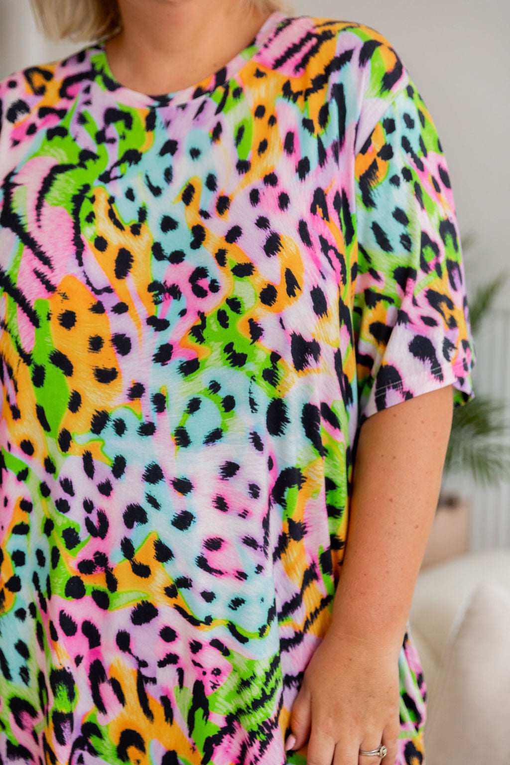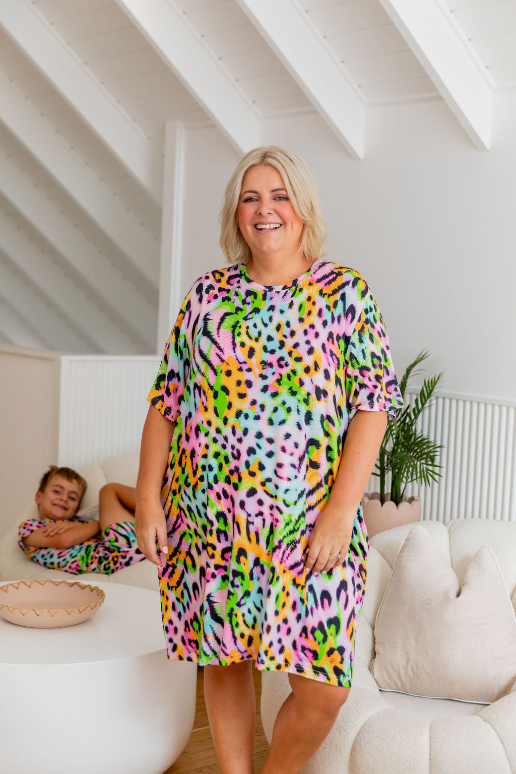Drift into dreamland in the Wild Nightie in Wild Dreams! With its relaxed fit, soft T-shirt sleeves, and comfy rounded neckline, this nightie is made for effortless lounging. Featuring bold leopard spots blended with a vibrant rainbow of pastel hues, it’s the perfect mix of wild and whimsical. Plus, it has side pockets for that extra touch of convenience! Available in sizes 6-30.