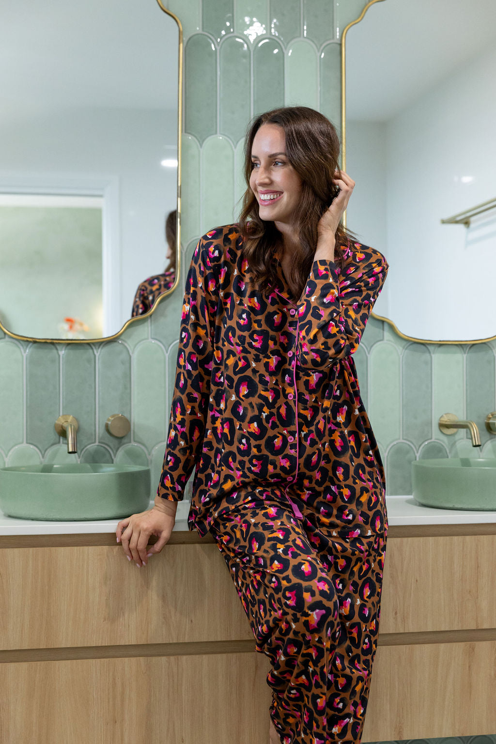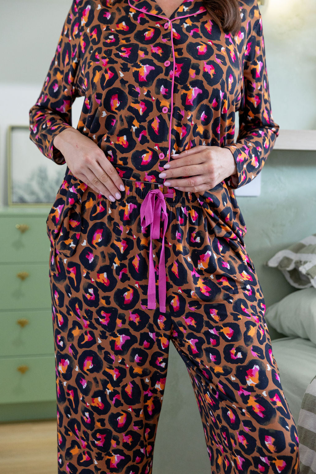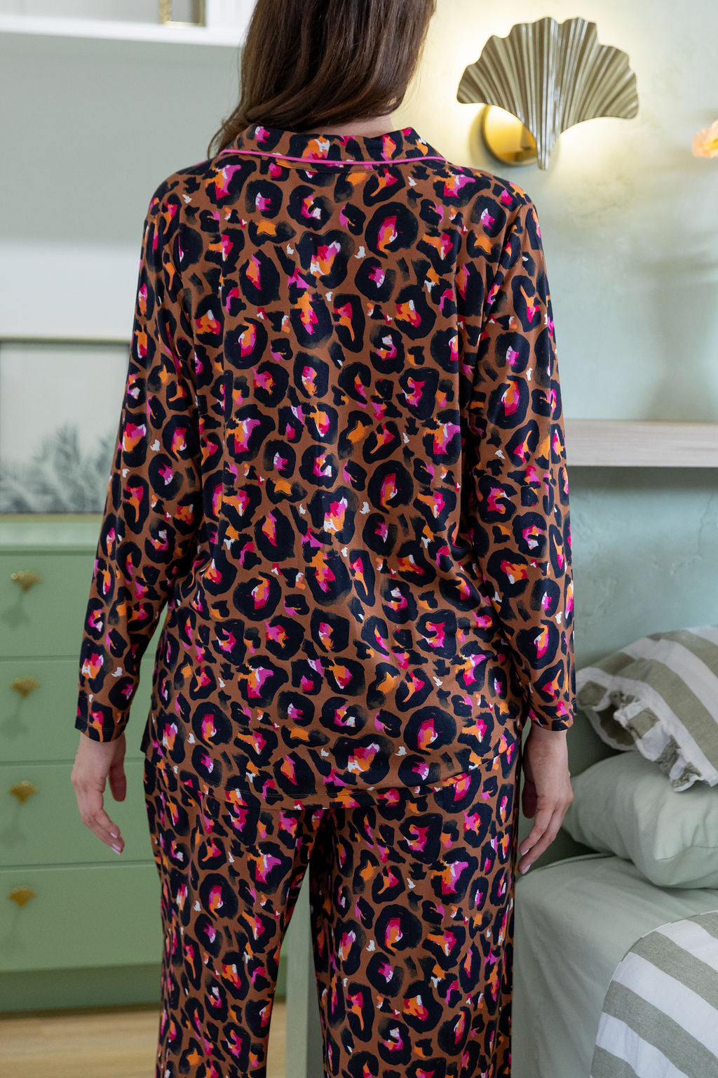 Unwind in wild style with the Zen Sleepwear Set by Kasey Rainbow! Featuring her bold Bronze Leopard print, this matching long sleeve shirt and pant duo is all about comfy vibes with a pop of personality.
